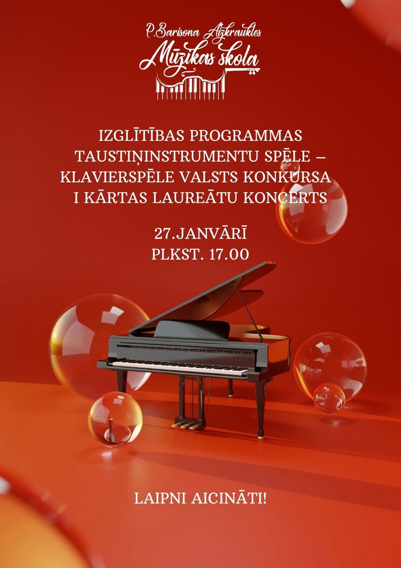 Izglītības programmas Taustiņinstrumentu spēle – Klavierspēle Valsts konkursa I kārtas laureātu koncerts 27.janvārī plkst.17.00, mūzikas skolas zālē.